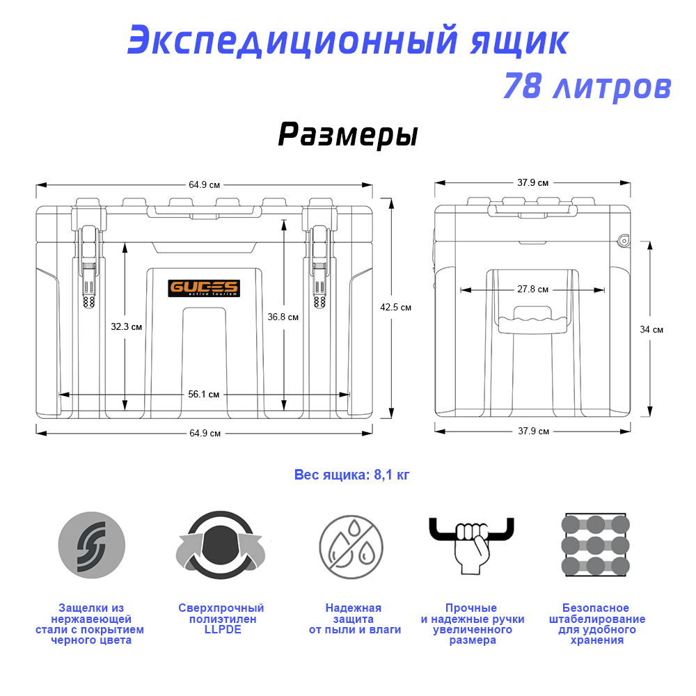 Туристік керек-жарақтарды, әртүрлі заттарды, азық-түліктерді немесе құралдарды тасымалдауға арналған жоғары сапалы GUDES 78 л экспедициялық қорап. Жәшіктер жоғары сапалы жоғары молекулалық салмақты полиэтиленнен жасалған, ол температураның өзгеруіне, тозуға, зақымдануға төзімді және аз күтімді қажет етеді. Ауыр салмақты корпус қара жабыны бар тот баспайтын болаттан жасалған құлыптар және шаң өткізбейтін тығыздағыш, бұл сіздің заттарыңыздың кез келген жағдайда әрқашан сенімді қорғалуын қамтамасыз етеді.