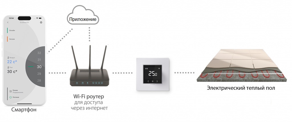 - Жылытуды қосарланған басқару: смартфоннан немесе термостат экранынан