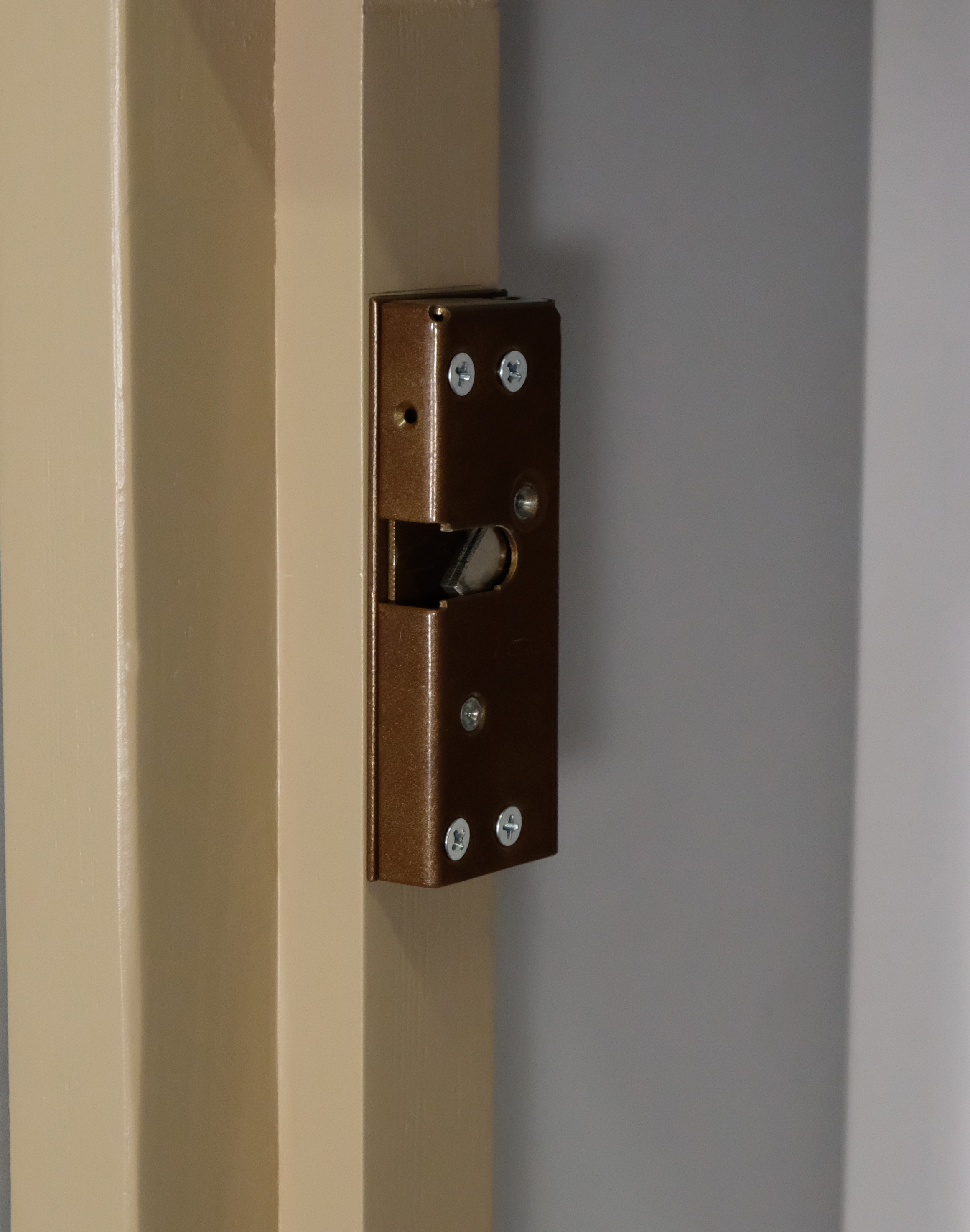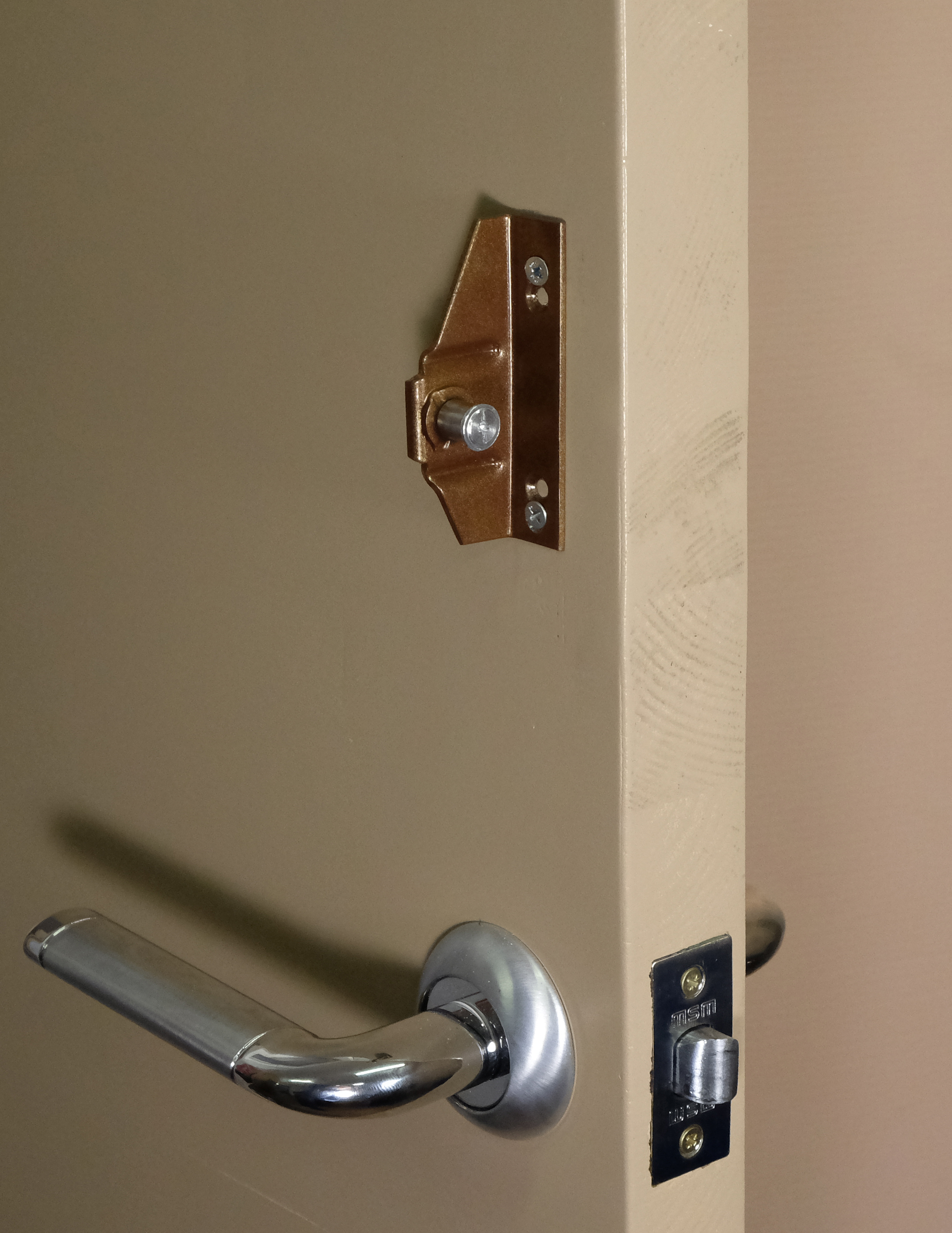 - Құлып есіктің тұтқасы аймағында орнатылады – жұмыс істеп тұрған кезде есік бұралмайды;